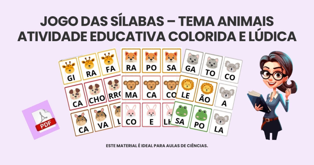 Jogo das Sílabas tema Animais Atividade Educativa Colorido e Lúdico